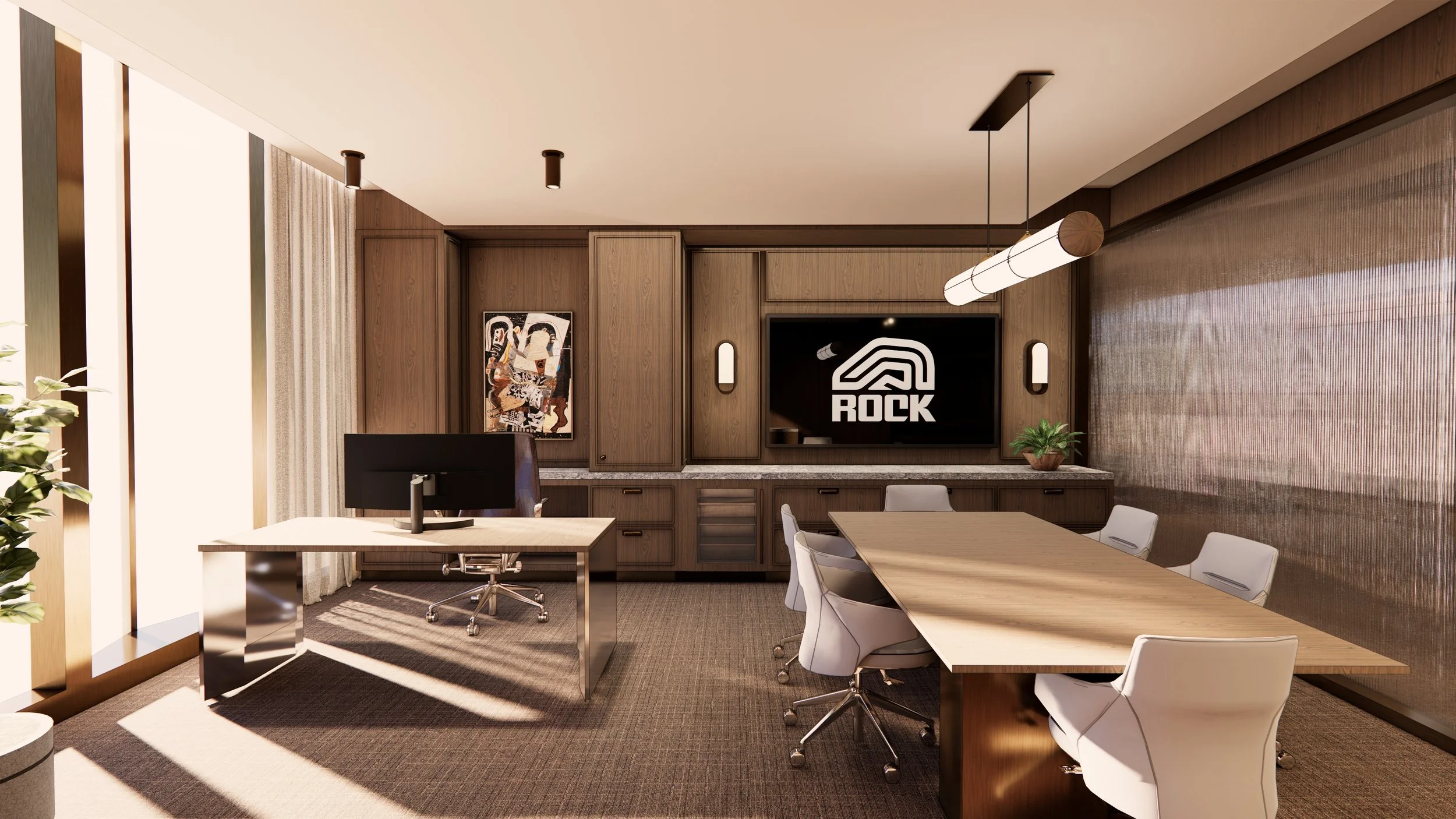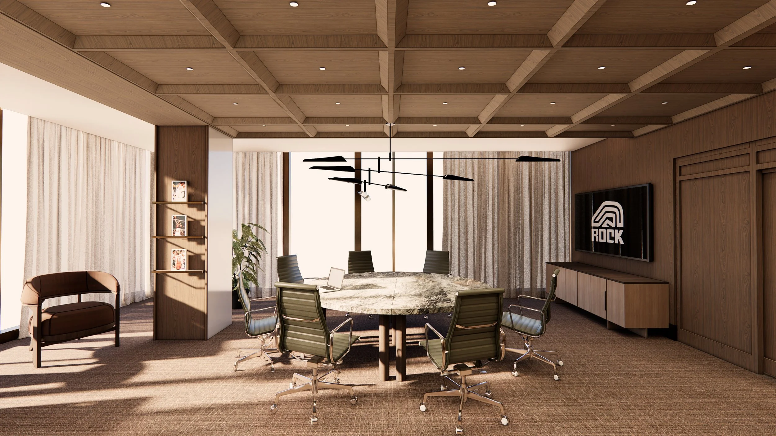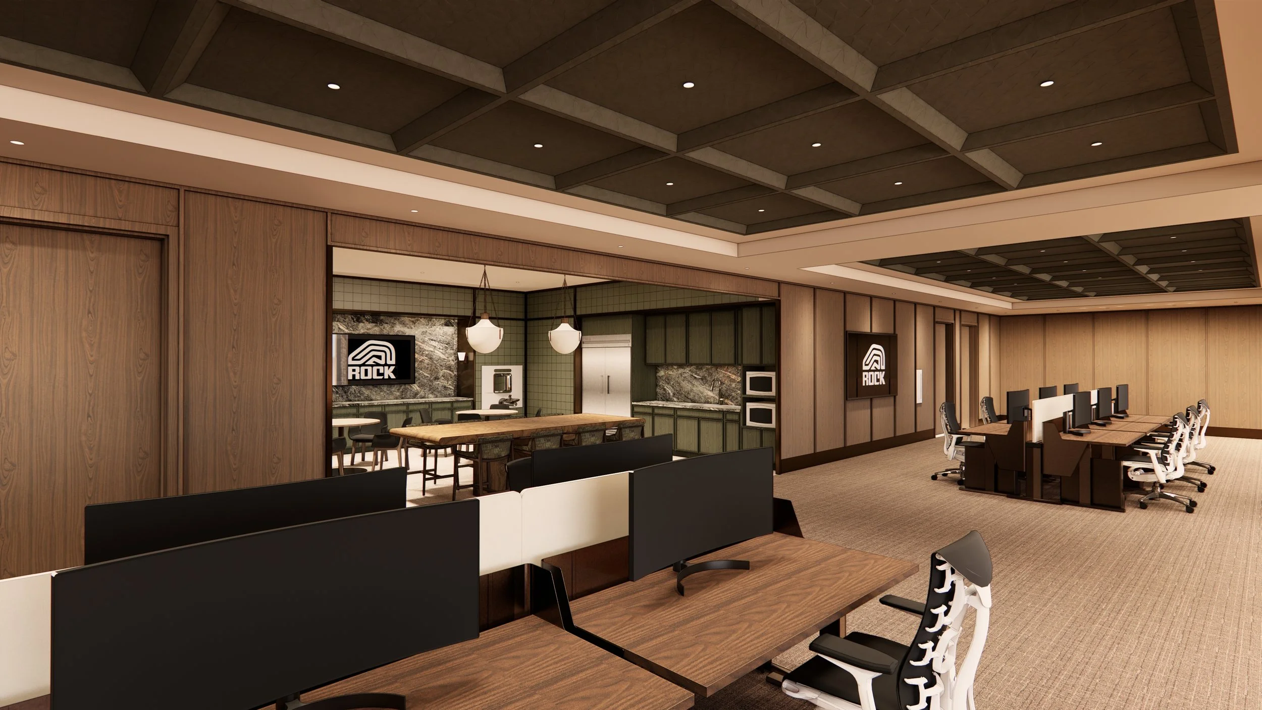 ROCK's move to Hudson's is rooted in legacy and heritage while looking forward to the future, creating an iconic new home for it's team members. A tailored reception lounge leads into a warm hospitality-focused gathering space that signifies a culture which values community as much as performance. Executive spaces are shaped to encourage equity around the table and clarity in conversation. The result is a workplace that feels grounded in Detroit’s spirit of industry and innovation. The space operates like a well-made suit, impeccable in construction, flexible in use, and timeless in its expression.