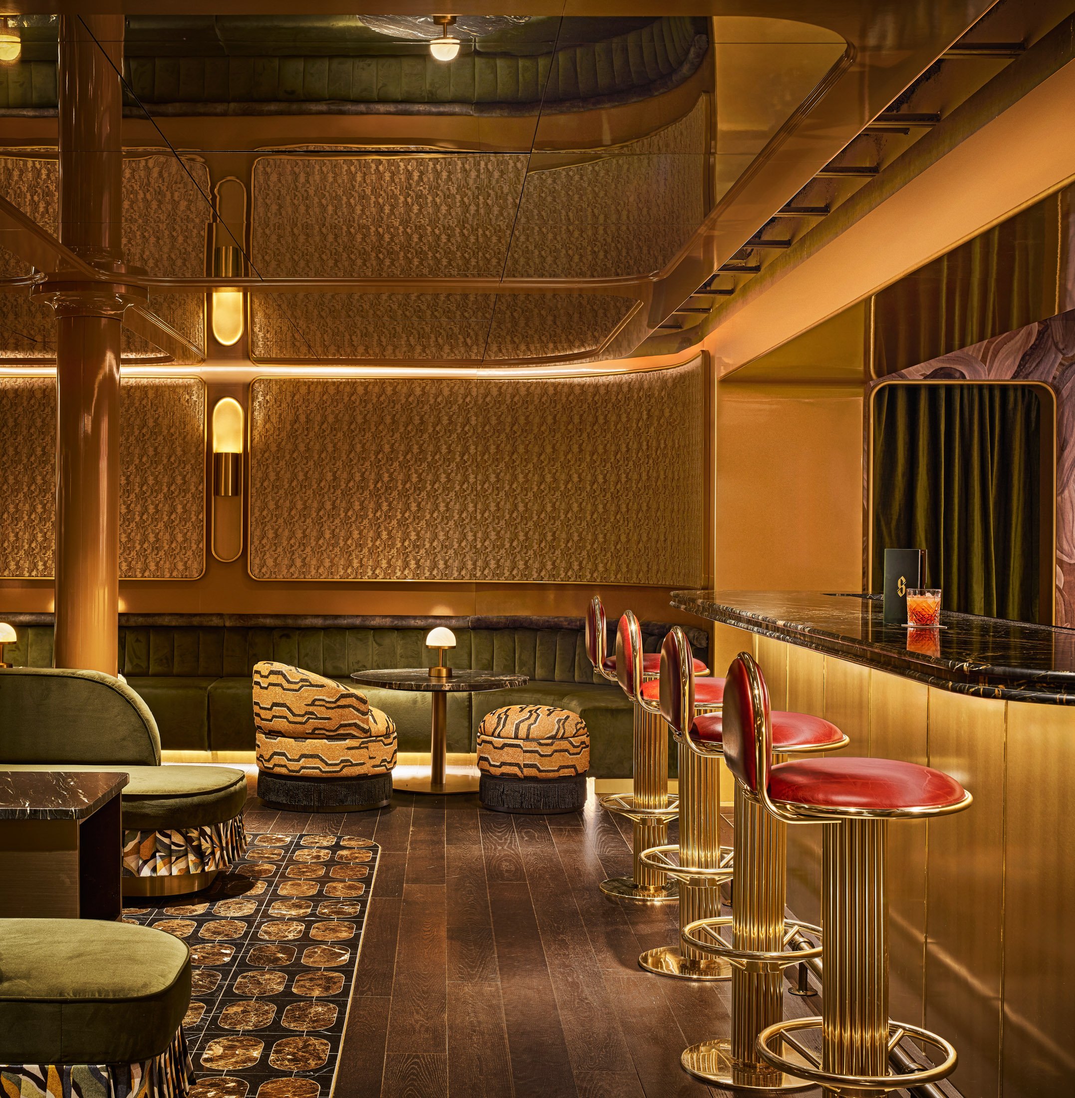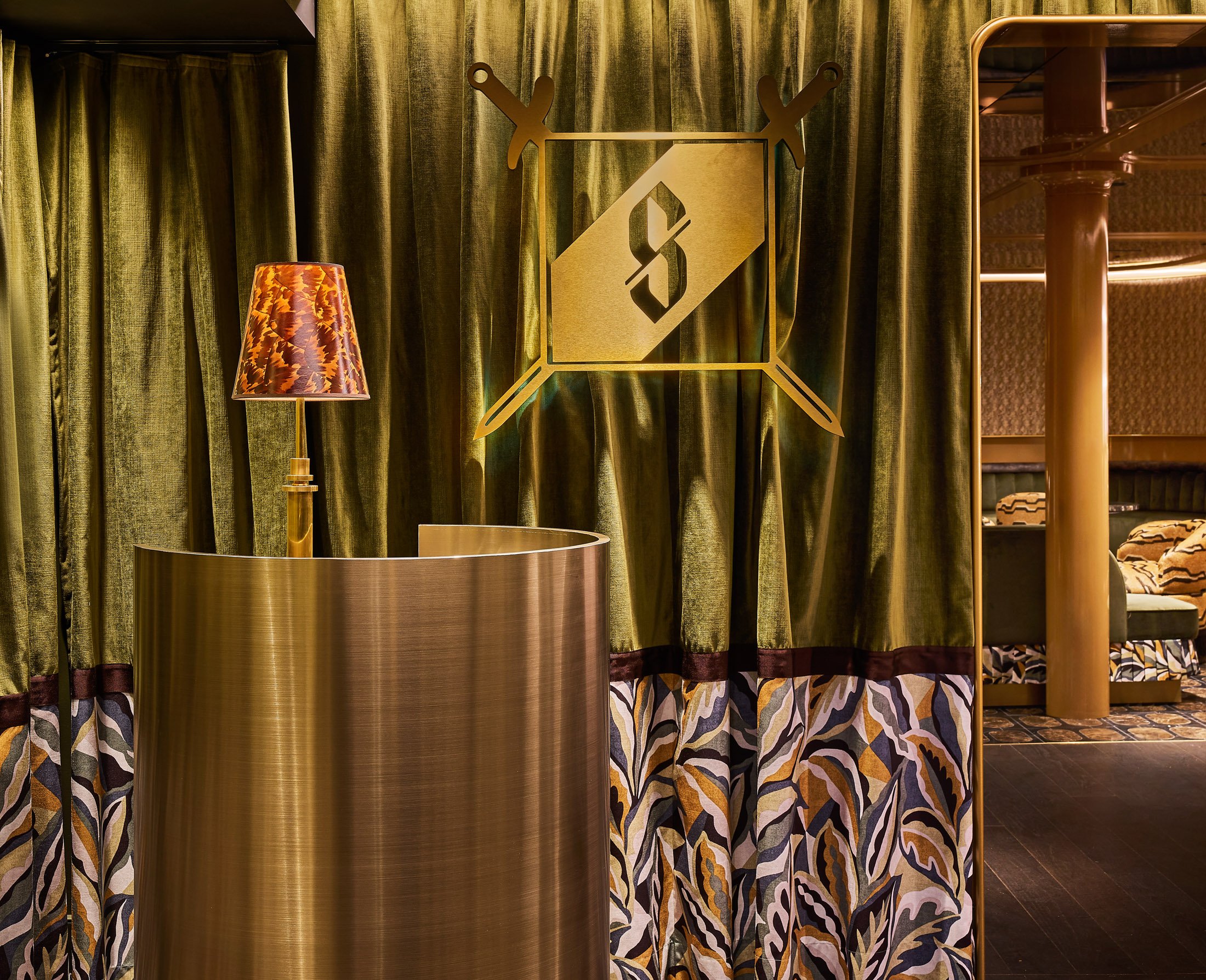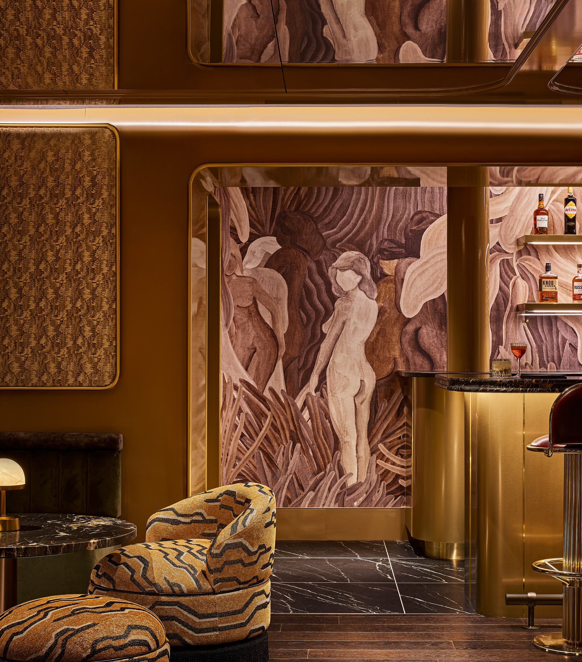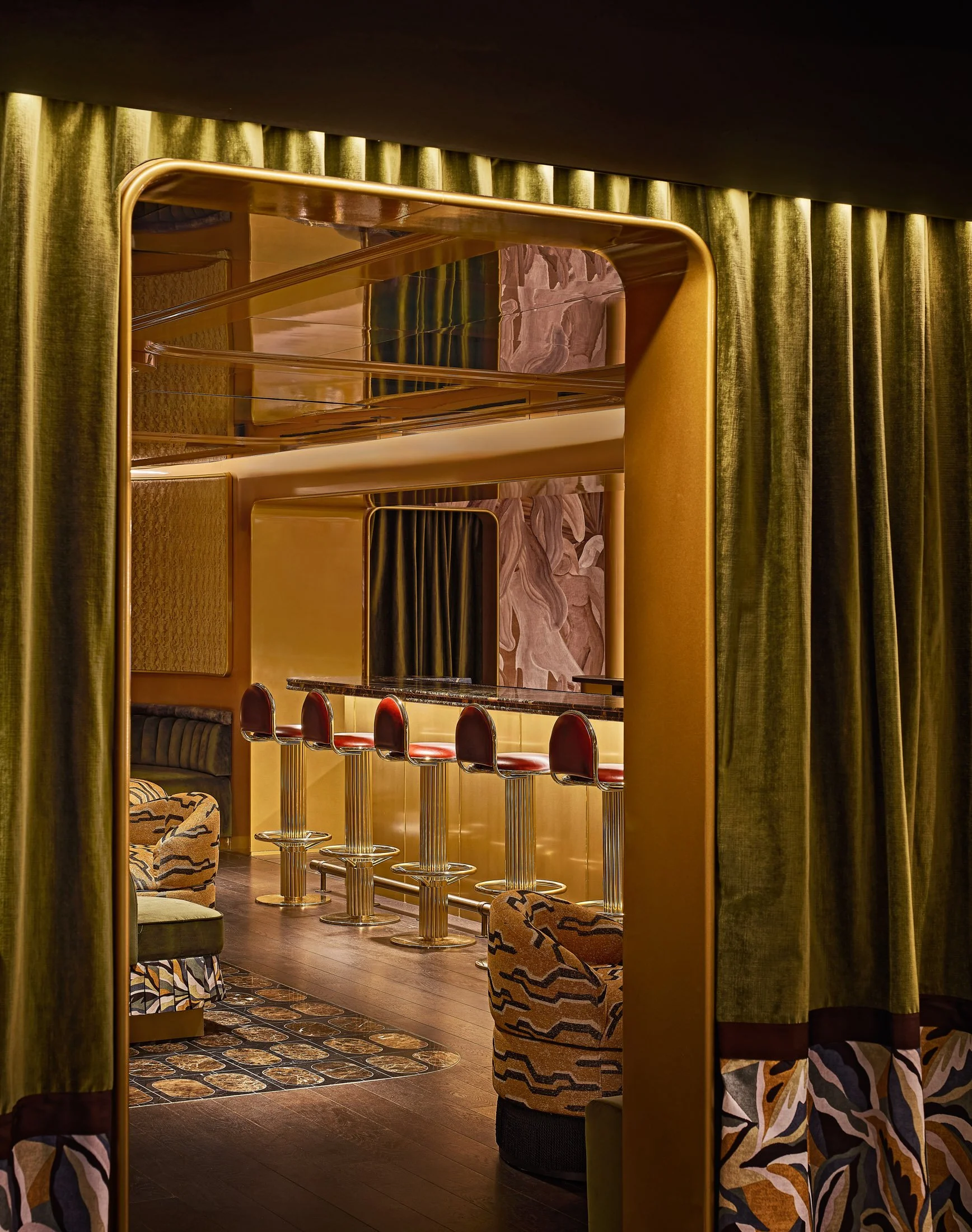 Born from the intersection of indulgence, mischief, charm, and sophistication- This Detroit Speakeasy is an undeniable invitation to immerse oneself within a seamless blend of opulence and warmth. The world above ceases to exist within this intimate space where elevated hospitality is bolstered by the refined use of glossy woods, sumptuous velvets, dreamy lighting, and adventurous patterns. Service is luxe but playful to deliver alluring energy within this moody and rich atmosphere. The main bar has a moody and rich atmosphere supported by sumptuous velvets, adventurous patterns, and mirrored ceilings. The entire perimeter is clad with lacquer to reinforce the ever present tie to the sixties.